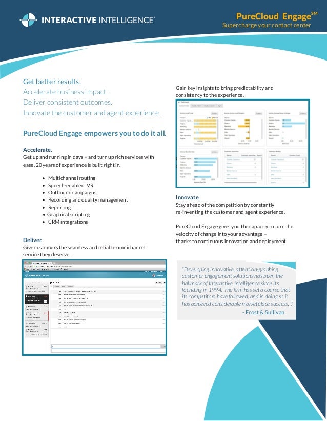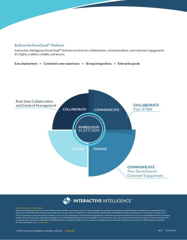 It offers comprehensive services for mid-sized to large organizationsin the cloud or on-premisesto help you meet ever-changing customer demands. PureCloud Engage which was released in North America Australia and New Zealand in June is being delivered to businesses. PureCloud by Interactive Intelligence provides your business with a solid foundation upon which to build innovative and reliable communications. Genesys Cloud CX is transforming the contact center industry by delivering innovation to companies of all sizes everywhere. This Interactive Intelligence PureCloud product overview is part of a series on unified communications as a service or UCaaS. Ask a sales representative about specific compliance matters including Business Associate Agreements BAAs and. Interactive Intelligence Group Inc.